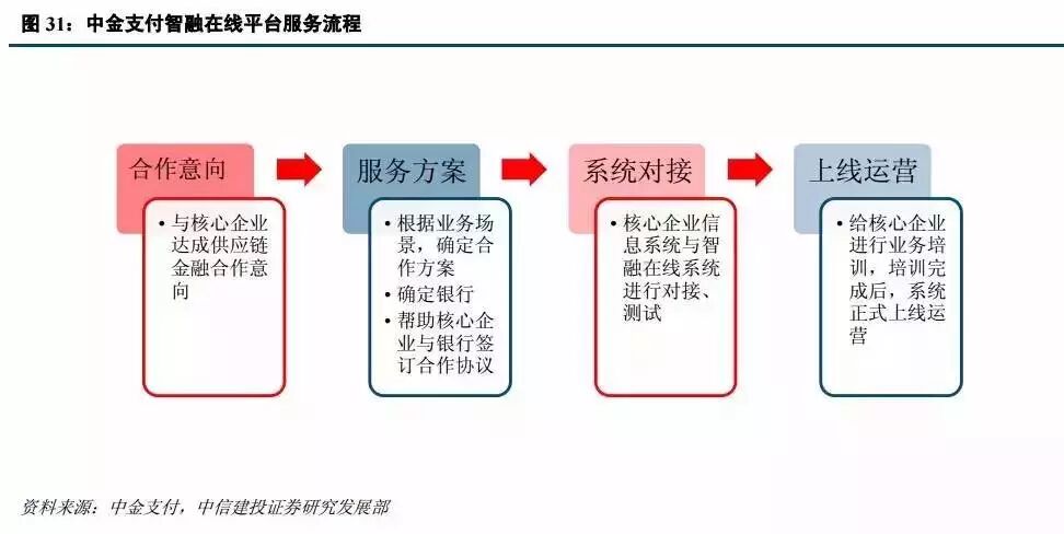 以中金支付的智融在线产品流程为例,首先与核心企业达成一个合作的意向,然后根据行业特点和业务场景,制作个性化方案。再根据核心企业的诉求,帮助其匹配资金方,三方探讨下形成合作协议。方案形成之后,平台进行系统对接,之后进行培训、上线。平台为不同的信息化建设水平的核心企业提供不同的方案。信息化水平高的企业平台直接提供接口,将产业链上的交易信息导入线上,上下游有融资需求的企业都可以在平台上发起融资请求;如果核心企业信息化水平较低,或者本身没有信息化系统,平台也可以为其提供系统支持。