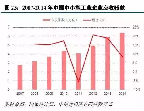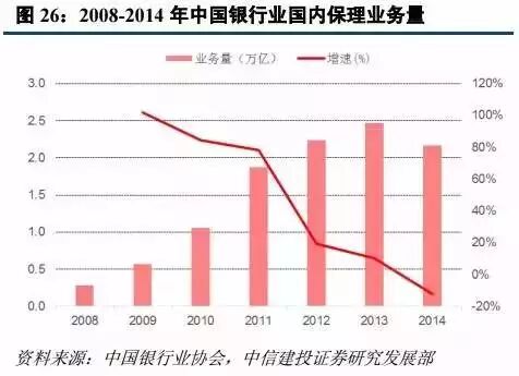 2014 年银监会公布《商业银行保理业务管理暂行办法》,对商业银行开展保理业务进行规范。针对应收账款项贴现管理的商业银行保理业务规模,近年来增长逐渐放缓,且在 2014 年出现了负增长。目前银行业国内保理业务量仅为 2.2 万亿,仅覆盖了大约 15%的应收账款融资需求,缺口巨大。