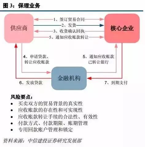 在供应链的环节中,核心企业行业话语权强,对上下游具有掌控能力,同时也对上下游有比较多的资金占用。在上图的例子中,核心企业向供应商购买原料,要求赊销,由于核心企业的强势以及供应商对其还款能力的信任,供应商同意赊销形成应收账款,这样它在备货过程中就需要垫资,流动性受到较大影响。此时金融机构可以通过购买债权的方式向供应商支付现金,从而解决它的流动性问题。核心企业的信用直接关系到应收账款坏账率,因此保理商对供应商的资质要求会比直接发放贷款要低的多。