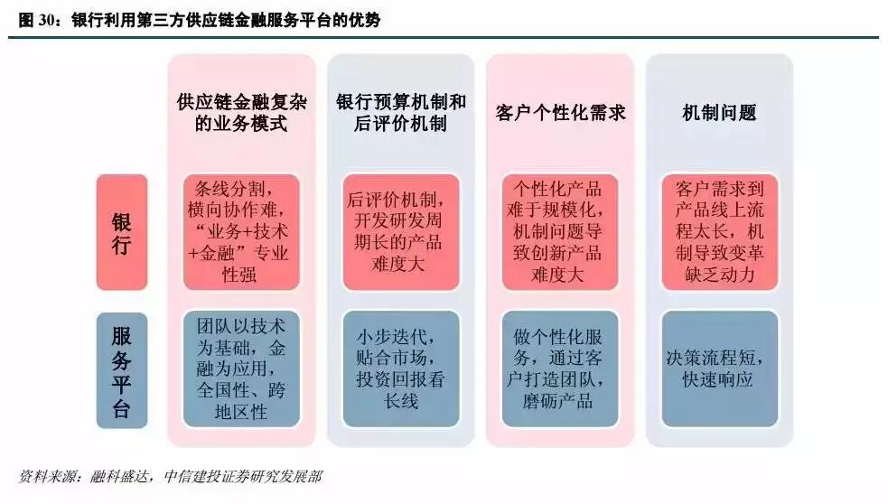 我们这里讲的平台是类似于前面提到的融信通和中金支付,通过信息接入,为核心企业和资金提供方搭建一个桥梁,提供供应链金融解决方案,实现业务在线化和交易环节可视化。其实质是利用互联网和数字认证技术帮助金融机构服务于实体企业。银行在这过程中也需要改变,如异地服务、流程改造等,但是无需过多成本就可以开拓新的业务。