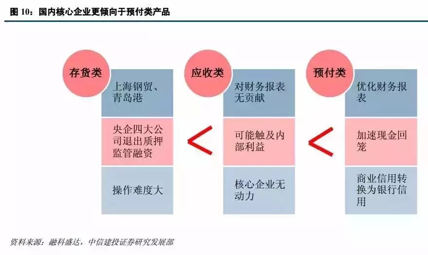 供应链金融是基于真实的交易背景开展的金融活动,实质是帮助链内成员盘活流动资产。国内供应链金融业务倾向性:预付类>应收类>存货类。预付类产品改善了核心企业的财务报表,加速了资金回笼,并将企业间的商业信用转换为了银行信用,因此更受国内核心企业的青睐。