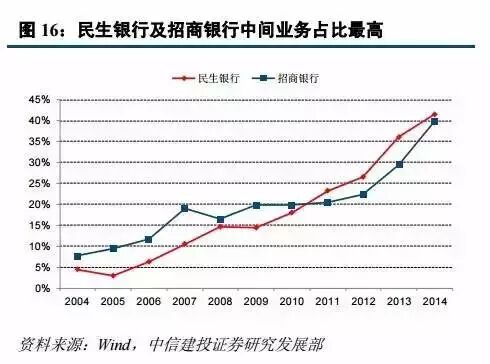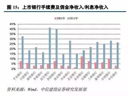 由于中间业务更能体现一家银行在金融科技服务、知识服务商的竞争力,上市银行手续费净收入和利息净收入的比值已从 10 年前的平均 6%提升到 14 年的平均 26%,民生和招商银行则超过了 40%,显现出金融服务技术的提升,然而相对于西方银行仍然偏低(14 年美国银行 60.8%、摩根大通 119.4%、富国银行 80.7%)。