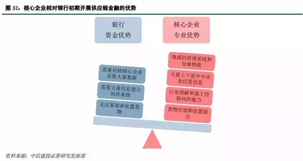 然而核心企业大概率上会局限在自身供应链里面,因为企业不能直接向企业借款,即便成立或收购保理和小贷公司,也受到资本性和区域性的限制。对于京东这样的互联网公司也存在同样的问题,更多的会针对于自身产业链上的应付账款做融资,而银行占比更大的业务,反而是下游经销商的客群。因此银行基于行基于商户管理,结算管理和传统的信贷数据的积累,可以实现与核心企业错位的合作和竞争。