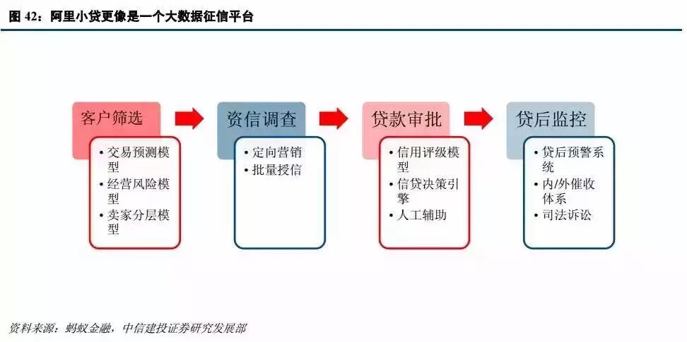 阿里的平台承接 B2C 交易过程中的信息流和资金流,形成闭环,拥有海量的中小企业交易和经营数据,因此可以开展基于真实交易背景的融资(如订单融资),但阿里小贷更像是一个大数据征信平台。另外重要的是,阿里对于其平台上的商户具有“生杀大权”,商户如果违约,存在信誉和经营上的隐性风险,对其具有较好的约束效果,是其风控手段之一。而相对来说,阿里大数据相对于 C 端的征信和风险定价产品更丰富,如差异化的运费险。