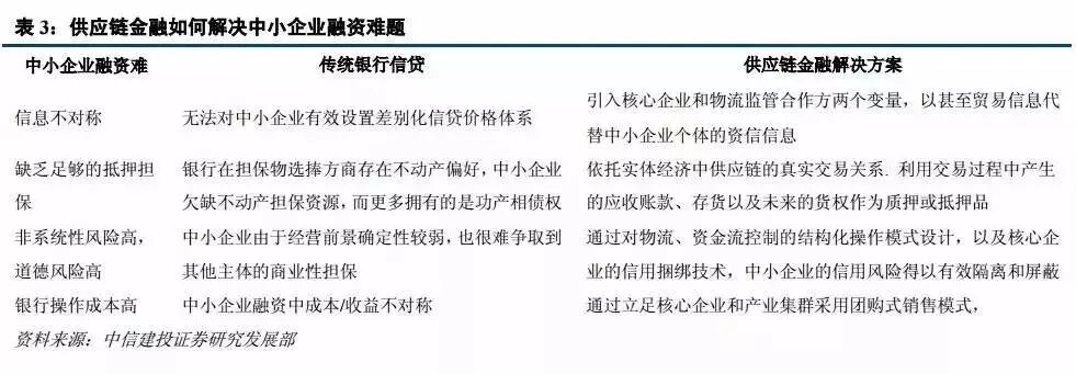 供应链金融帮助中小企业解决融资难的问题;帮助银行实现差异化竞争、开拓中小企业市场,可以使其利用高附加值的服务绑定核心企业和客户集群;帮助核心企业提升整个产业链的效率;核心企业也可以作为资金提供方,为供应链成员尤其是中小企业提供资金,满足了核心企业产业转型升级的需要,通过金融服务变现其长期积累的行业专业和资源。