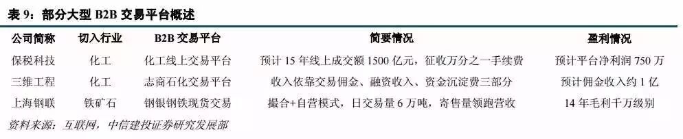 另一种平台不是通过接入式的,而直接作为供应链上的交易平台,即 B2B 平台。虽然电子商务在零售业获取巨大成功,但目前大宗商品电子交易平台却困难重重。这主要是因为 1、买卖双方习惯传统模式,线上交易不大;2、与物流实体脱节,信息系统不统一,仓储运输环节能力不足;3、大额交易,合同和结算比较谨慎;4、企业自营的平台比较多。宝钢、鞍钢、首钢都建设了自己的电商交易平台,销售自己的货物,试图整合交易客户的内部供销链。